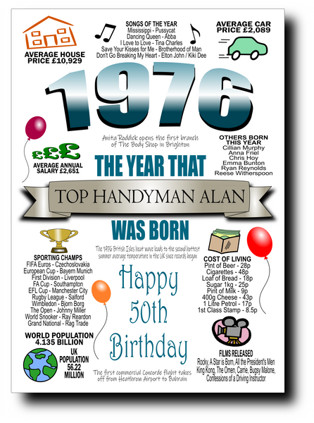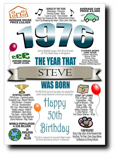50th BIRTHDAY CARD BIRTH YEAR, FULL OF FUN FACTS