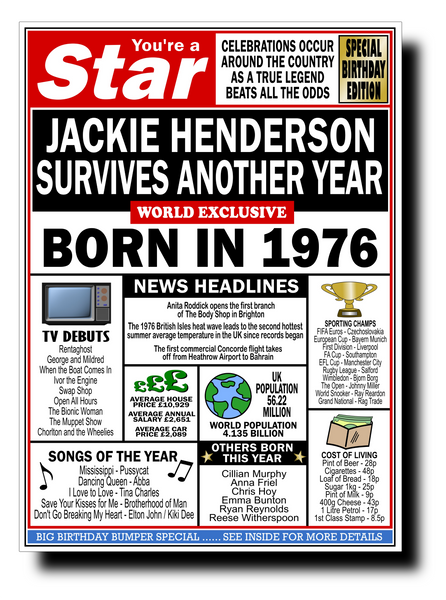 ๐ŸŒŸ Full of researched memories and facts of the year the recipient was born, converted as an amusing imitation newspaper
